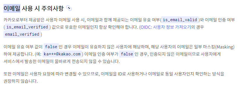 마지막으로 AccessToken을 통해 email과 nickname을 인증 용도로 사용한다는 것입니다. 아래는 이에 대한 kakao developers의 주의사항입니다.