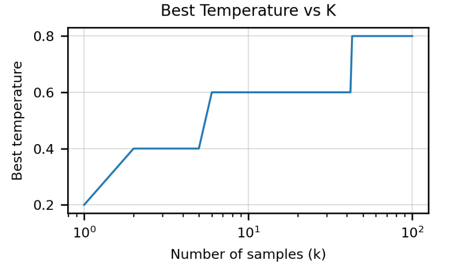 학습 과정에서 temperature 최적화도 중요했다. Temperature는 모델이 다음 토큰을 선택할 때 얼마나 다양하게 선택할지를 결정한다. 낮은 temperature는 가장 확률이 높은 토큰만 선택하고 높은 temperature는 다양한 시도를 가능하게 한다. 연구팀은 pass@k의 k 값에 따라 최적 temperature가 달라진다는 것을 발견했다. pass@1은 T=0.2처럼 낮은 값이 좋았고 pass@100은 T=0.8처럼 높은 값이 좋았다. 다양한 시도를 해야 그중 하나라도 맞을 확률이 높아지기 때문이다.