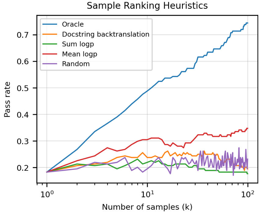 마지막으로 실용적 관점에서 중요한 문제가 남았다. 100개의 코드를 생성했는데 사용자에게는 1개만 보여줘야 한다면 어떤 것을 선택해야 할까? 세 가지 전략을 비교했다. 첫째는 무작위 선택으로 성능이 약 20%였다. 둘째는 “신탁(oracle)” 전략으로 모든 샘플을 테스트해 통과하는 것을 선택하는 방식이다. 약 72%의 성능을 보였지만 현실적으로 불가능했다. 테스트가 항상 있는 것도 아니고 100개를 다 실행하는 것도 비현실적이기 때문이다.