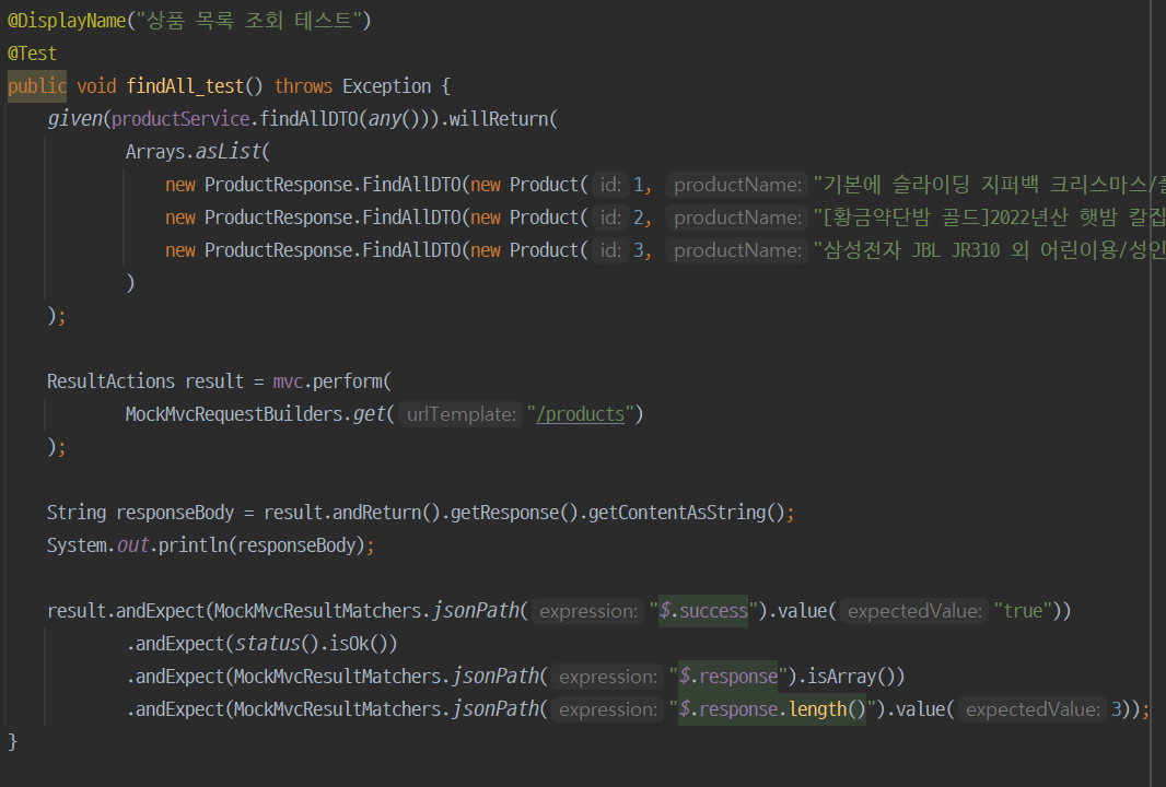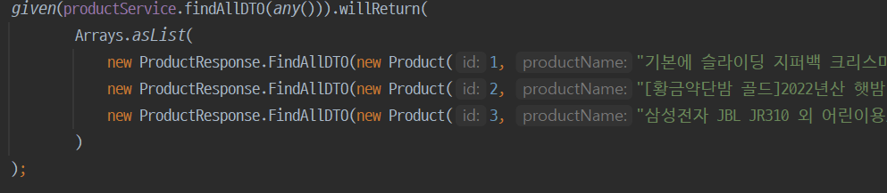 위의 코드가 Mockito를 사용한 부분이다. “productService.findAllDTO(*any*()) 의 코드를 만나면 매개변수로 어떤 것이 있어도 다음과 같은 코드를 리턴해라.” 라는 의미라고 볼 수 있다.