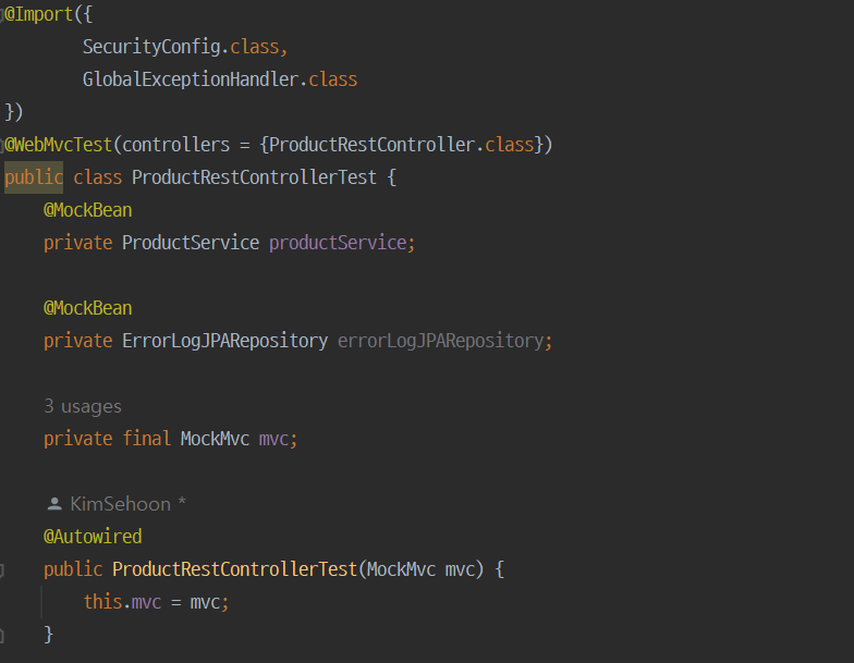 부가적으로 테스트 코드는 의존성 주입이 자동적으로 안되기 때문에 @Autowired 로 수동 주입해줘야 한다. 주입 방법에는 3가지가 있지만 spring에서는 불변 객체, 순환 참조 문제 발생 등으로 생성자 주입을 권장하고 있다. 또한 productService를 @MockBean 으로 등록했다.