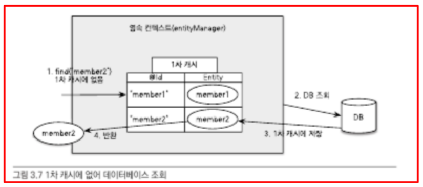 - 만약 1차 캐시에 엔티티가 없으면 DB에서 엔티티를 조회하고 1차 캐시에 저장한다