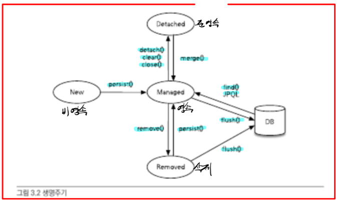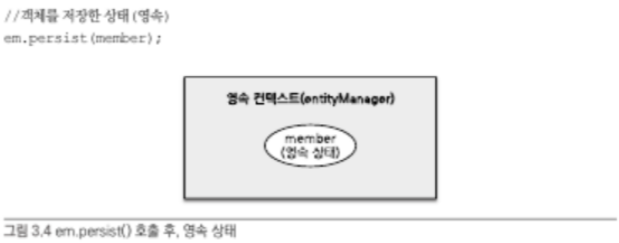 - 엔티티 매니저로 엔티티를 PC에 저장하는 등 PC가 관리하는 엔티티를 영속 상태라 함