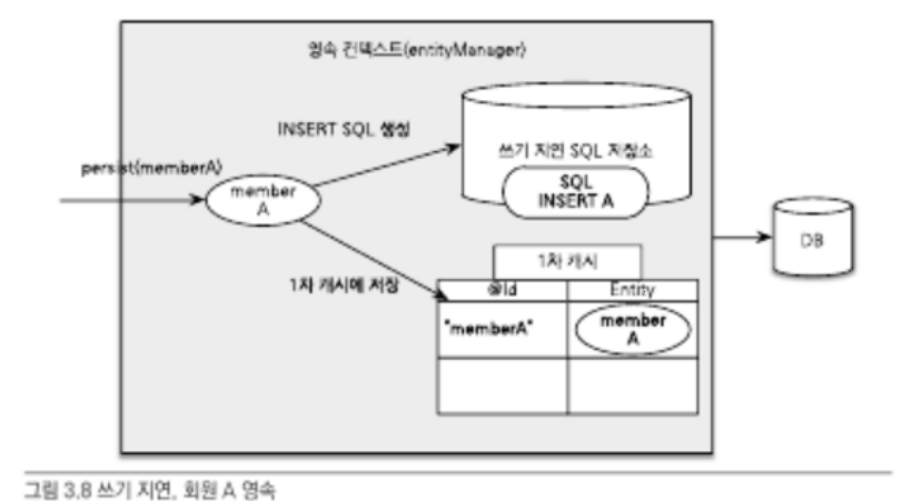 엔티티 매니저는 트랜잭션을 커밋하기 직전까지 DB에 엔티티를 저장하지 않고 내부 쿼리 저장소에 INSERT SQL을 모아둔다. 그리고 커밋 시 모아둔 쿼리를 한번에 DB에 보내는데 이것을 트랜잭션을 지원하는 쓰기 지연이라고 한다. 이 기능을 잘 활용하면 모아둔 쿼리를 한번에 전달해서 성능을 최적화할 수 있다.