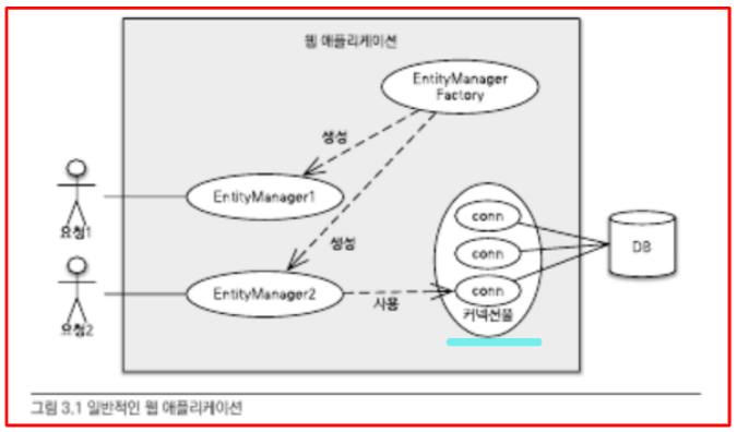 그림과 같이 엔티티 매니저는 DB 연결이 꼭 필요한 시점까지 커넥션을 얻지 않는다. 예를 들어 트랜잭션이 시작할 때 커넥션을 획득한다. ‘커넥션을 연결 해놓으면 더 편할거 같은데 왜지?’라고 생각이 들 수 있다. 이에 관해서는 여러 이유가 있지만 일단 커넥션 풀은 한정적이다. 따라서 리소스 관리와 성능 향상을 위해 커넥션을 미루는 이유가 있다. 또 하나는 JPA는 지연 로딩을 허용한다. 이로 인해 불필요한 쿼리 실행을 방지하고 애플리케이션 성능을 향상시킬 수 있는데 지연 로딩에 관해서는 다음에 설명할 기회가 있을 것이다.