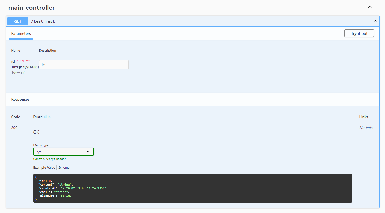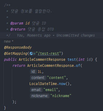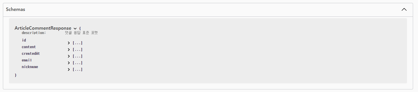 위와 같이 @Schema 등 swagger annotation을 사용해서 추가하는 방법도 있습니다. 근데 저는 개인적으로 문서화를 하기 위해 원래 있던 순수한 코드에 대해 덕지덕지 어노테이션을 붙이는 건 가독성과 효율성 때문에 좋아하지 않습니다.