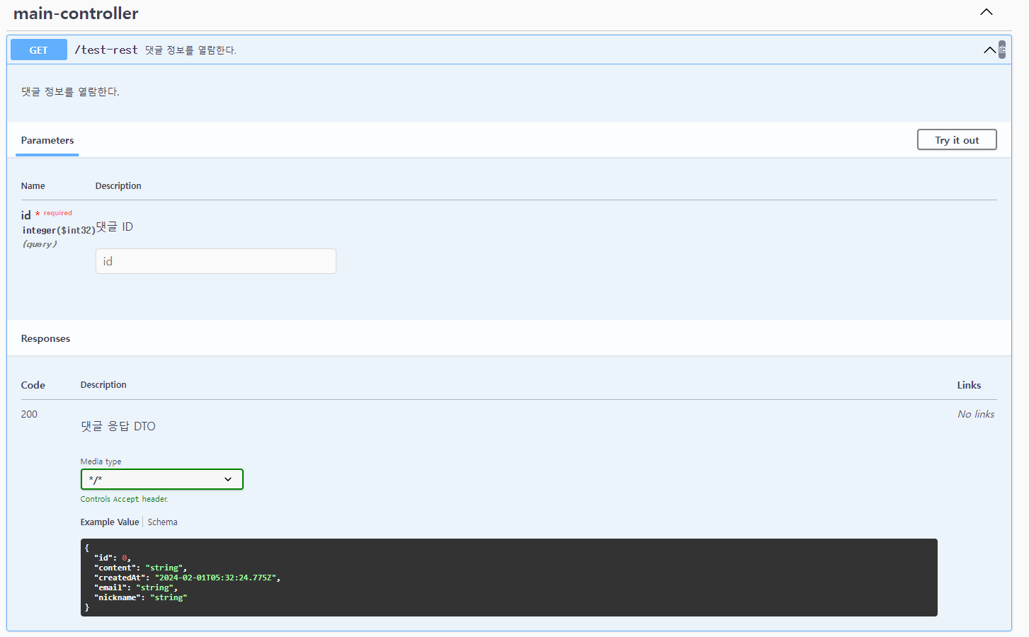 그런데 swagger를 보신 분들이라면 좀 허전한 느낌을 받으실 것 같습니다. 아무 설명이 없기 때문입니다. 문서화를 하는 이유 중 하나가 이해를 더 잘하기 위함인데 아무 설명이 존재하지 않으면 슈크림 없는 붕어빵과 같다고 생각이 듭니다.