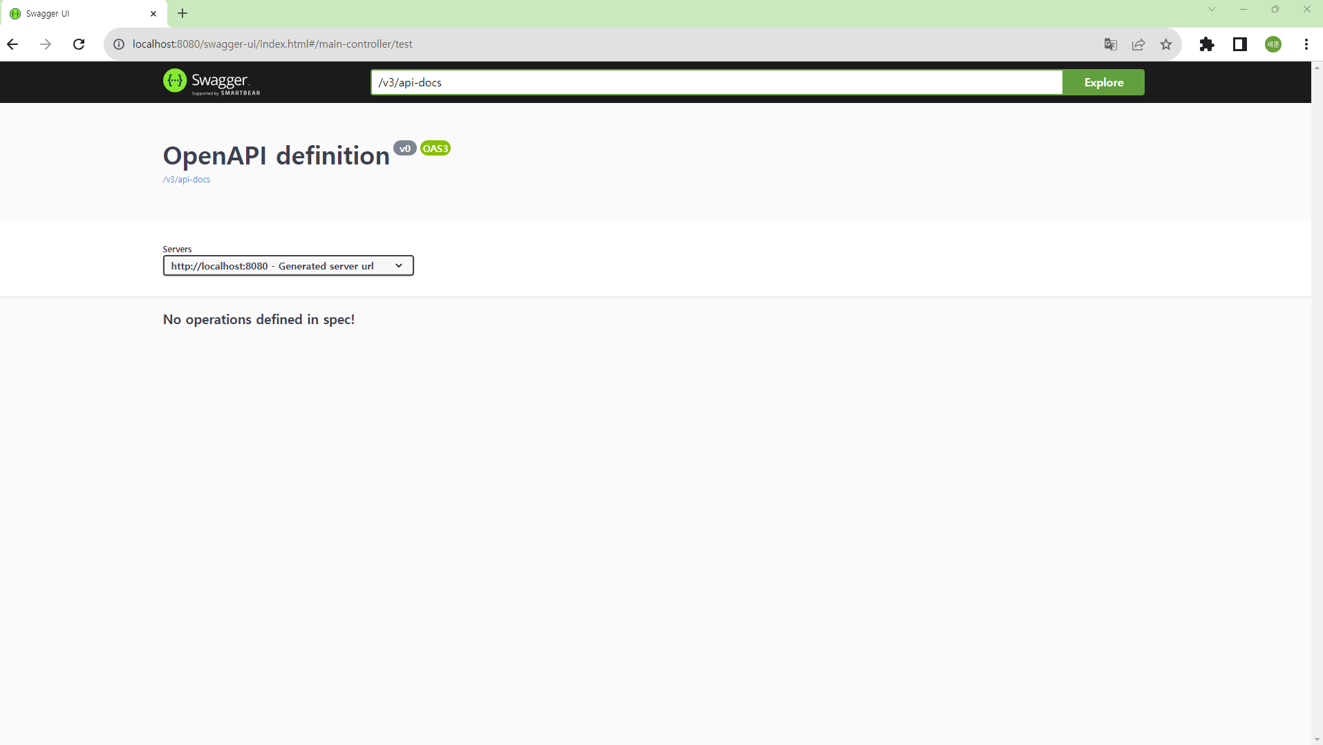 아직 Controller에 아무것도 구현해놓지 않았기 때문에 위와 같이 여백의 페이지가 나옵니다. 간단하게 테스트를 한번 해보기 위해 MainController에 테스트 코드를 작성했습니다.