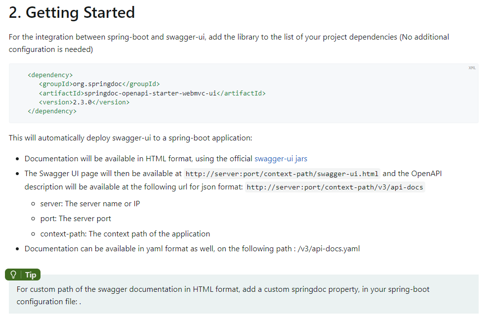 현재는 Open API로 존재하는데요 따라서 저희가 사용하기 위해서는 dependency를 gradle에 추가해줘야합니다. 이런 swagger에 환경 설정 방법에 대해 잘 알려주는 공식 문서가 있는데요 바로 springDoc입니다 아래의 링크로 확인하실 수 있습니다.